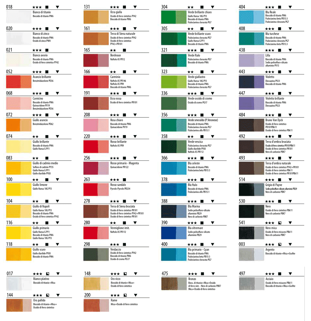 Formulato con pigmenti di qualità, altamente concentrati, stabili alla luce, coprenti e miscelabili, su base vinilica; una volta asciutto forma una pellicola resistente ed elastica.