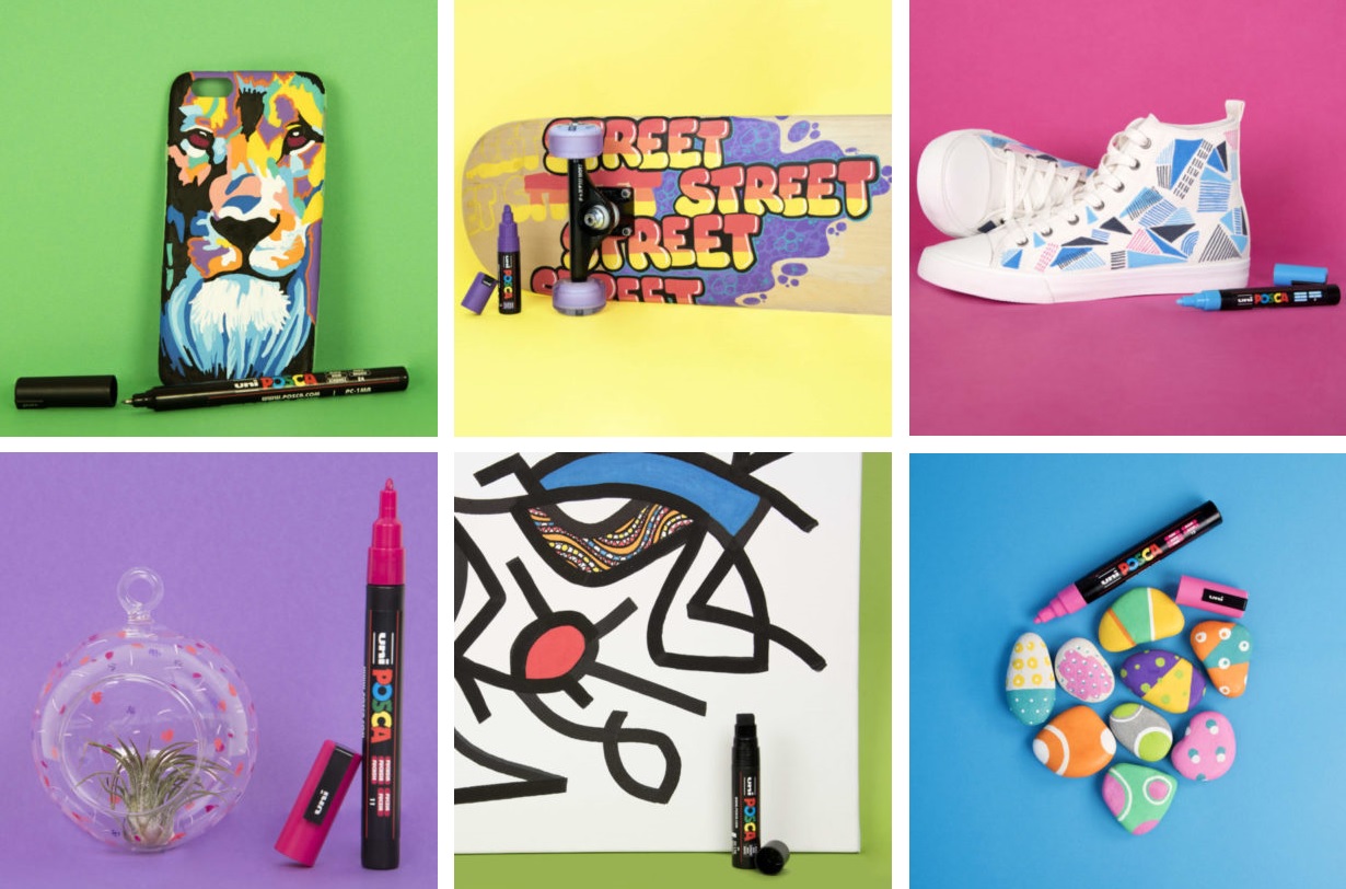 L’originale marcatore a tempera acrilica coprente e permanente su qualsiasi superficie. La gamma comprende 37 colori base, 8 metallizzati e 6 fluo.
